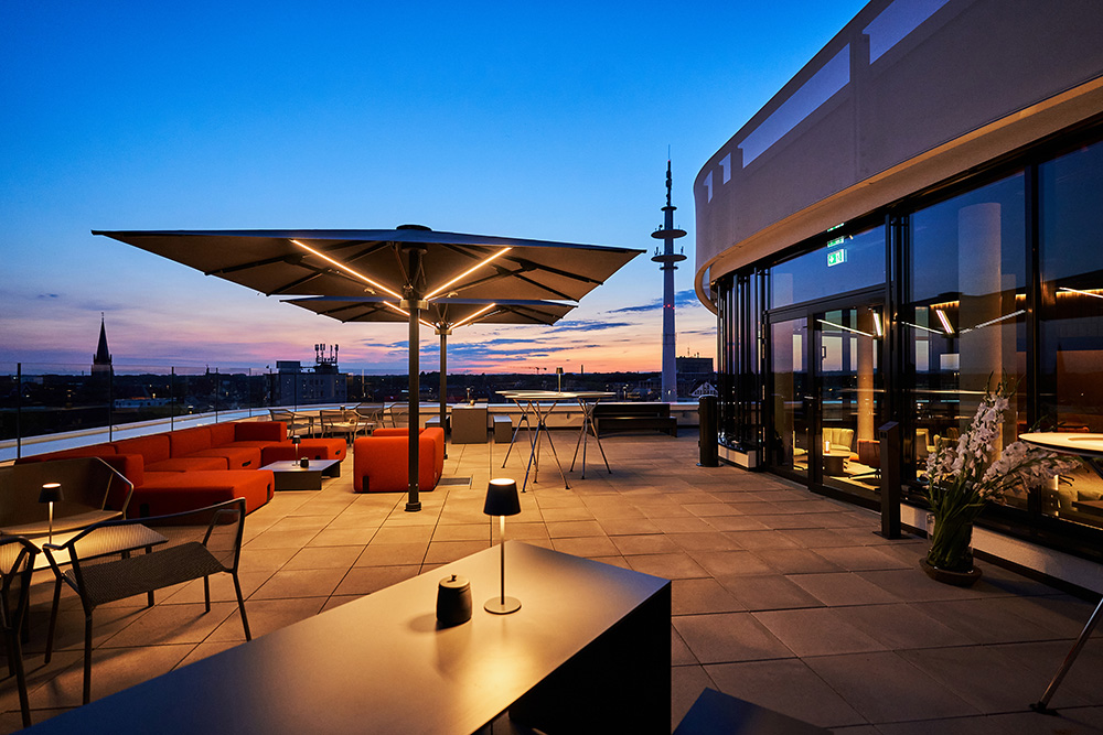 Les parasols géants à mât central offrent, s’ils sont ancrés au sol, une résistance au vent de plus de 60 km/h. Cela ne constitue pas une décharge de responsabilité pour l’exploitant, mais lui permet d’assurer le service en terrasse !