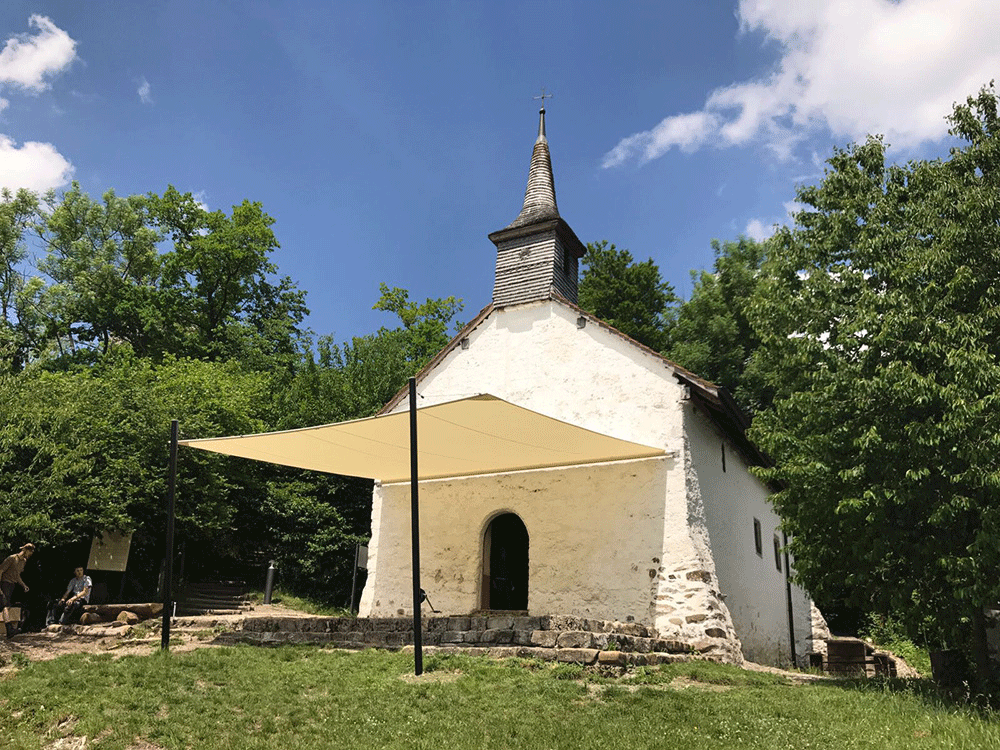 La voile est fixée à la façade à l’aide de pontets muraux.