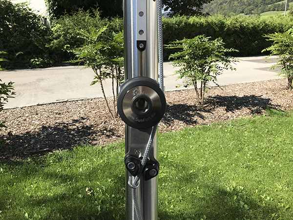 Pour une voile enroulable manuelle, tout est plus flexible : si les conditions le permettent, la voile peut être fixée uniquement avec des pontets muraux, sans aucun mât.