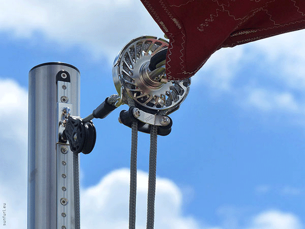 L’enroulage et le déroulage se font à l’aide de cordages, winchs et coinceurs. C’est tout l’esprit nautique de la voile enroulable manuelle.