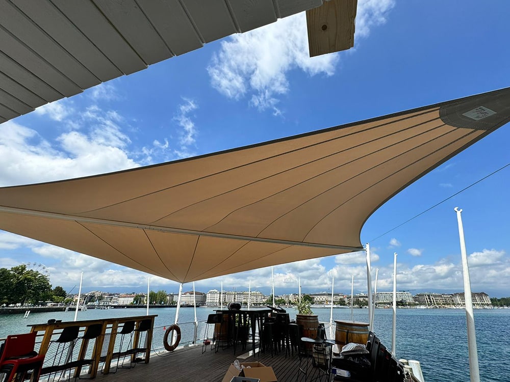 Grâce à une voile enroulable de 90 m2 et d’un axe d’enroulage de 14 m, il est possible d’ombrager de grands espaces.