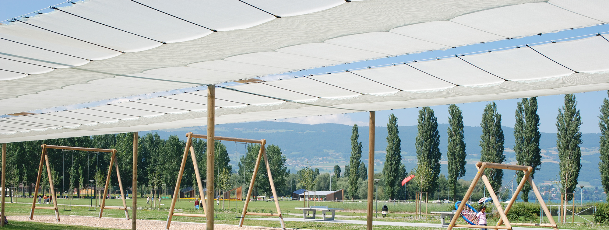 Les voiles d’ombrage permettent de couvrir de grands espaces. Elles sont particulièrement adaptées aux espaces publics tels que piscines, terrasses de restaurants, aires de jeux, places de quartiers, parcs publics, espaces de détente ou sportifs.